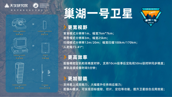 巢湖一号卫星是“天仙星座”首发星,其应用需求由天地信息网络研究院(安徽)有限公司提出,天仪研究院为卫星总体,中国电子科技集团公司第三十八研究所(简称“中国电科38所”)为载荷总体,联合负责卫星的研制。这也是天仪研究院与中国电科38所继联合研制我国首颗商业SAR卫星海丝一号后的第二次合作。