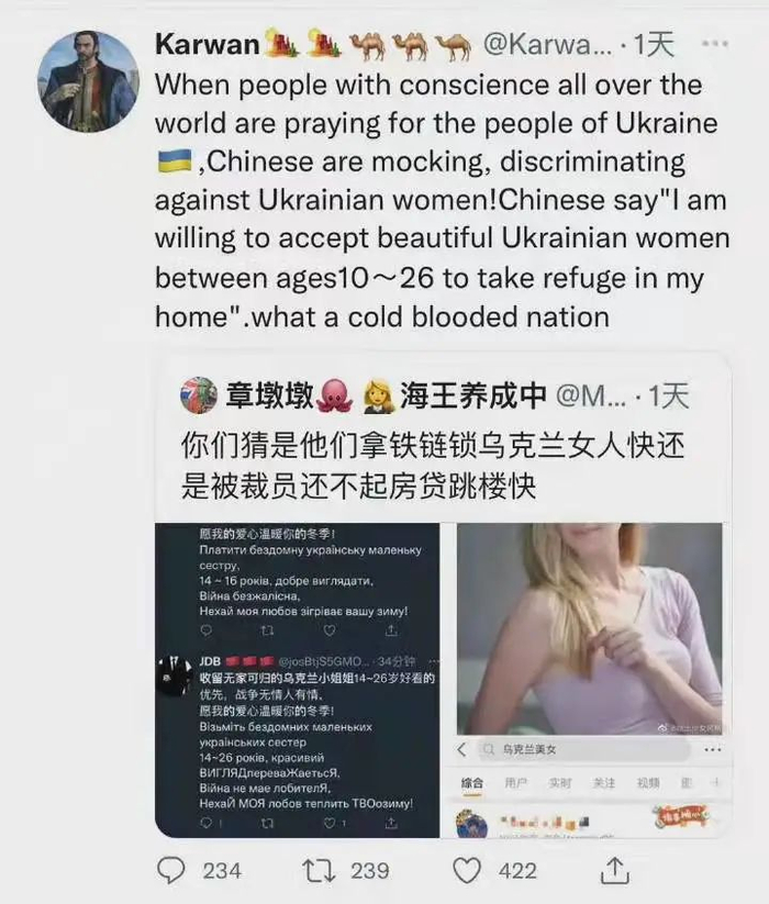 再由ID为@Karwan70446933 的账号进行英文转译,从而引发第一波的关注。之后,一个域名为supchina.com的网站以此舆论为噱头,发布了题为《Some Chinese men express their horniness for potential Ukrainian refugees, to the disgust of netizens》的文章,将所有矛头导向中国网民。这类信息随后被传入在乌克兰的华人圈,并引起了一部分华人的警惕,不少人将此信息发布在中国大陆的微博平台,其中微博ID为I0nGnnn-账号(目前搜寻不到该账号)发布的信息点爆了舆论场,获得了超6万转发,近50万点赞,千万级阅读量的传播。同时,QQ空间ID为@牛岛若利 的账号发布的相关信息,也在特定青少年群体中获得了1500多万的转发。