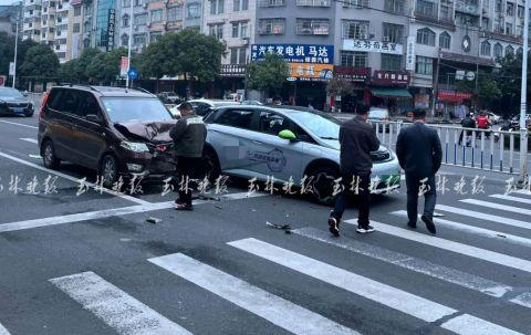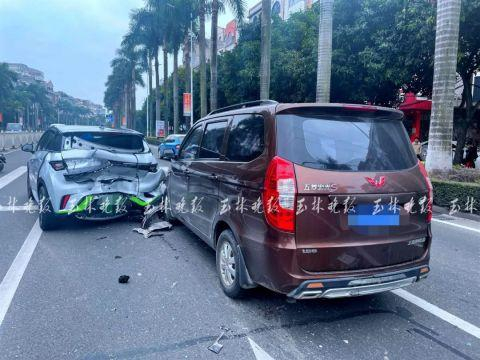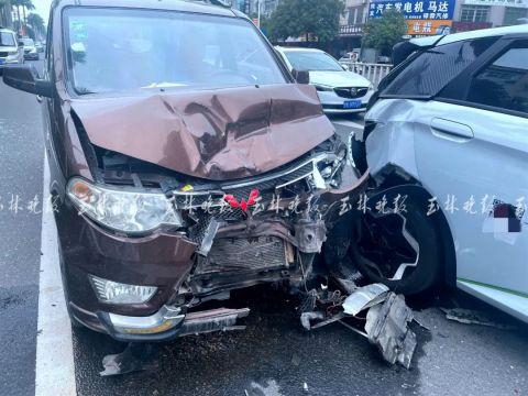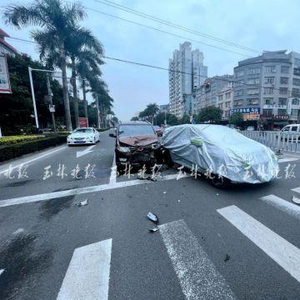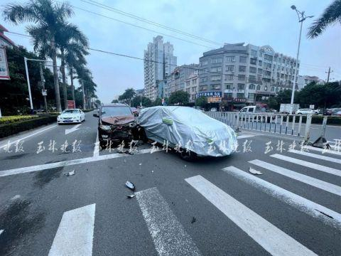 26日中午,在玉林城区一环北路美林街路口斑马线附近,一辆比亚迪新能源车礼让斑马线,后面的五菱面包车刹车不及撞了上去;发生交通事故后,被追尾的比亚迪立刻用车衣把车辆罩起来。