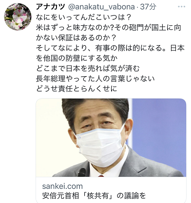 还有人说:“这家伙在说什么。美国能一直是朋友吗?能保证枪口不对准(日本)领土吗?最重要的是,(如果核共享)事态发生时,将成为靶子。是想让日本变为其他国家的护壁吗?到底卖国到什么地步才算完,这可不是当了这么多年首相的人能说出来的话。反正(安倍)还不对言论负责。” ↓