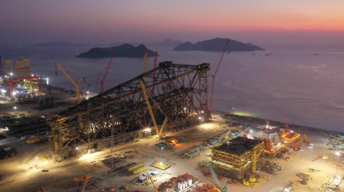 施工期间的亚洲第一深水导管架“海基一号”。