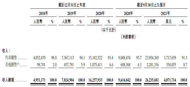 而随着交付量的增加,蔚来的营收也逐年递增。招股书显示,蔚来2018年、2019年、2020年及2021年前9个月的营收,分别为49.51亿元、78.25亿元、162.58亿元和262.36亿元。