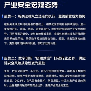 报告指出,2022年,产业安全相关配套机制将会持续落地,进一步按照行业、领域、地域、场景等细分,制定相应的行业实施细则与实践指导。
