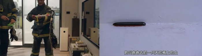 左为《瀑布》中客厅里的蛇,右为《停车》中天花板上的虫