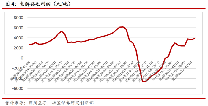 国内电解铝利润保持高位。电解铝三大成本项煤炭、氧化铝、阳极持续回落,国内煤炭价格持续受发改委稳价影响,我们预计未来难以再大幅上涨,电解铝成本端上涨压力较小,目前国内电解铝利润为约3900元/吨,预计1-2季度电解铝企业利润保持在3500元/吨以上区间。