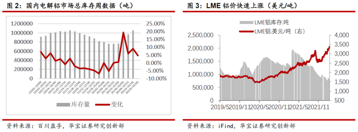 我国电解铝产业供需紧张格局或将持续。海外俄乌事件前的供需紧张格局并未转变,海外现货升水走高,据SMM测算,国内原铝进口利润下滑至-2187元/吨,国内电解铝进口窗口被彻底关闭。2021年我国进口电解铝158万吨,而在今年海外铝价进口亏损幅度更大的情况下,国内电解铝进口供给将出现缺失。从需求的维度看,欧洲电解铝生产与俄罗斯电解铝出口受阻,可能造成欧洲部分下游企业被迫转向中国进行电解铝或铝加工品采购,也将利好国内电解铝消费,从供需两方面支撑国内铝价继续强势上涨。需要注意的是,虽然国内本周库存仍在增加,社会铝锭库存回升至110.5万吨附近,但累库幅度放缓,出库规模回升,预期去库预期将兑现。当前铝市,短期国内供给难以快速放量,而海外缺货格局延续,种种因素均导致短期内全球铝供应偏紧,而若美国制裁俄铝,则会进一步加深全球铝供应偏紧的格局,对铝价形成有效的支撑与上行驱动。