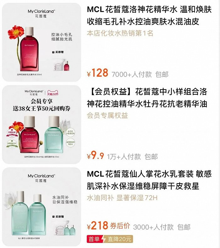 目前其天猫旗舰店的销量产品为洛神花精华水,月销7000+件,中样组合销量达1万+件。