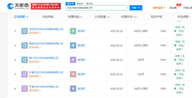天眼查APP显示,2月22日至2月25日,沈阳万达汽车科技服务有限公司、贵阳万达汽车科技服务有限公司、长春万达汽车科技服务有限公司、银川万达汽车科技有限公司、天津万达汽车科技有限公司接连成立,注册资本均为500万,法定代表人均为曾茂军,5家新公司均由万达汽车科技服务有限公司全资持股。
