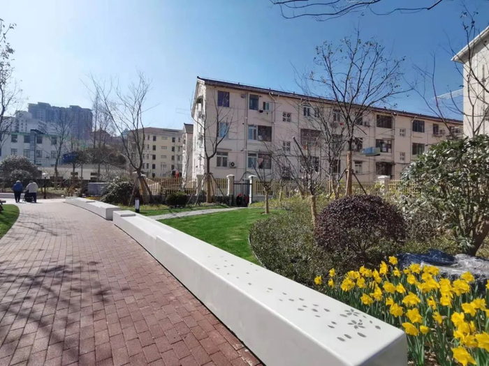 为了让居民群众能够走得进去、坐得下来,天山绿地里设置了不少公共座椅,座椅以泰科石为基底,配以防腐木木饰,并在石材上增加樱花花瓣的阴刻图案,与飘落的樱花动静呼应。