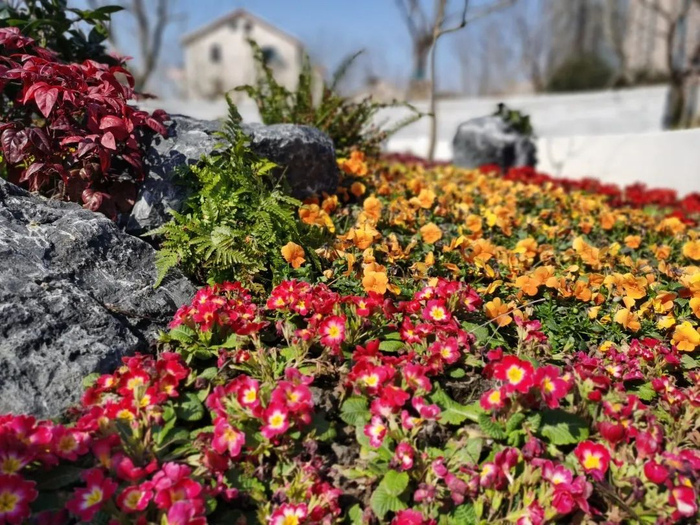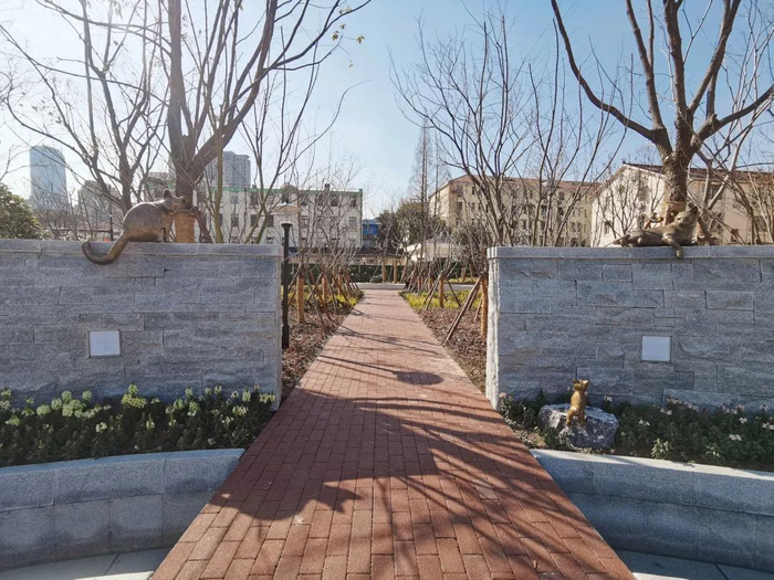 入口广场处,通过微地形处理,布置了以造型鸡爪槭、茶花、火焰南天竹等植物为主的花坛,生机勃勃。花坛的背后是四块环形石景墙,有古典园林的意境,景墙上坐卧着两三只“小猫”,充满生趣。