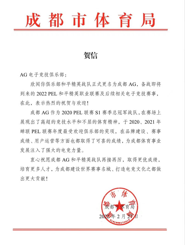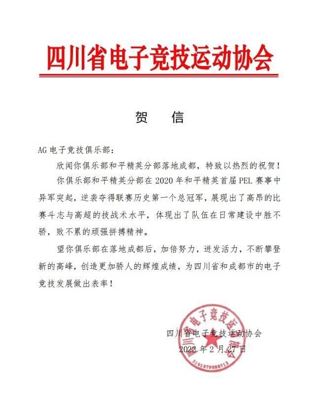 成都市体育局、四川省电子竞技运动协会等部门组织闻讯后纷纷发来贺信,祝贺AG和平精英战队落地成都,表达了对成都AG和平精英战队未来发展和共同打造成都成为赛事名城的美好祝愿。成都AG和平精英战队也将以此为激励,学习借鉴之前的地域化有益成果,不断进行新尝试,力争成为成都的城市新名片,实现战队和城市的双赢。