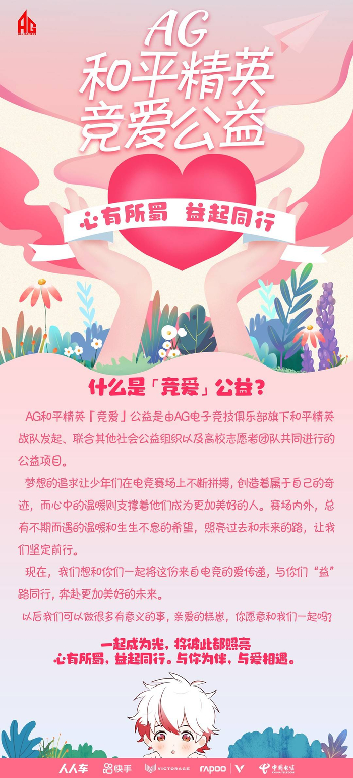 在社会公益方面,成都AG和平精英战队也进行了规划和尝试,打造地域化公益项目——“竞爱”公益,以“心有所蜀,益起同行”为口号,致力于打造一个以成都为中心的电竞公益项目,弘扬电竞人正能量,为成都营造更良好的电竞环境贡献自己的一份力量。