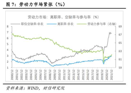 2021年二季度以来,反映美国劳动力成本变化的雇佣成本指数(ECI)和亚特兰大联储薪酬增长指数,均出现明显提高,远超2%的长期通胀目标(图6)。疫后美国劳动力薪资和成本的上升,一个很重要原因是美国劳动力市场的紧张。尽管疫后第二年即2021年劳动参与率有所提高,但离疫前水平仍有不小差距,加上离职率不断创出历史新高,共同导致职位空缺率大幅攀升,从4.5%快速提高到7.0%,远超历史水平(图7)。对于美国劳动力市场紧张、职位空缺率的空前提高,是暂时现象还是中长期趋势,争议较大。美联储主席鲍威尔认为部分原因是人口老龄化、提前退休以及疫情的影响,面对新一波病毒的冲击,尚不清楚劳动力短缺将持续多久。