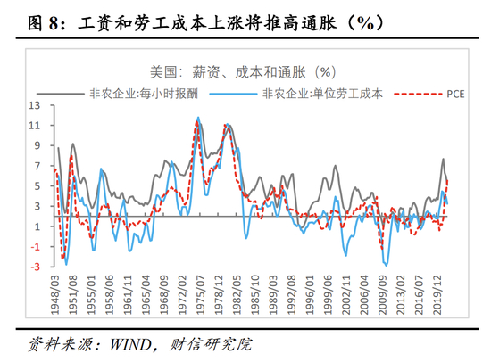 劳动力市场紧张导致薪资上涨,会提高企业单位劳工成本,而薪资和劳工成本的抬升,最终会在通货膨胀上反映出来。美国1948年以来的历史经验充分证明了这一点,前两个指标与通货膨胀PCE同步性强、联动明显(图8),表明在中长期内工资的涨跌变化确实会充分反映在通胀中。