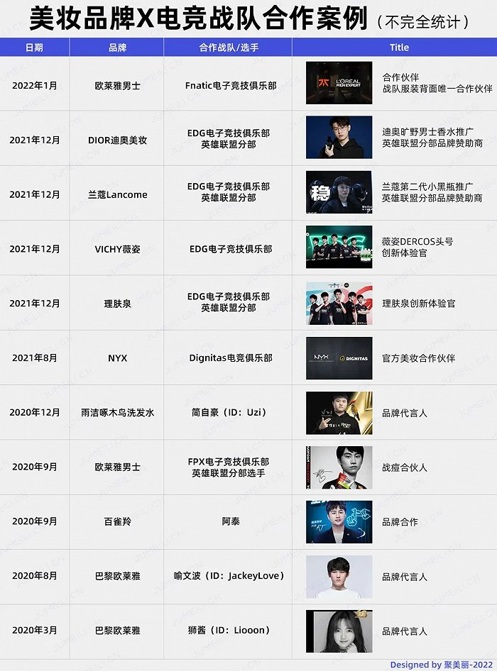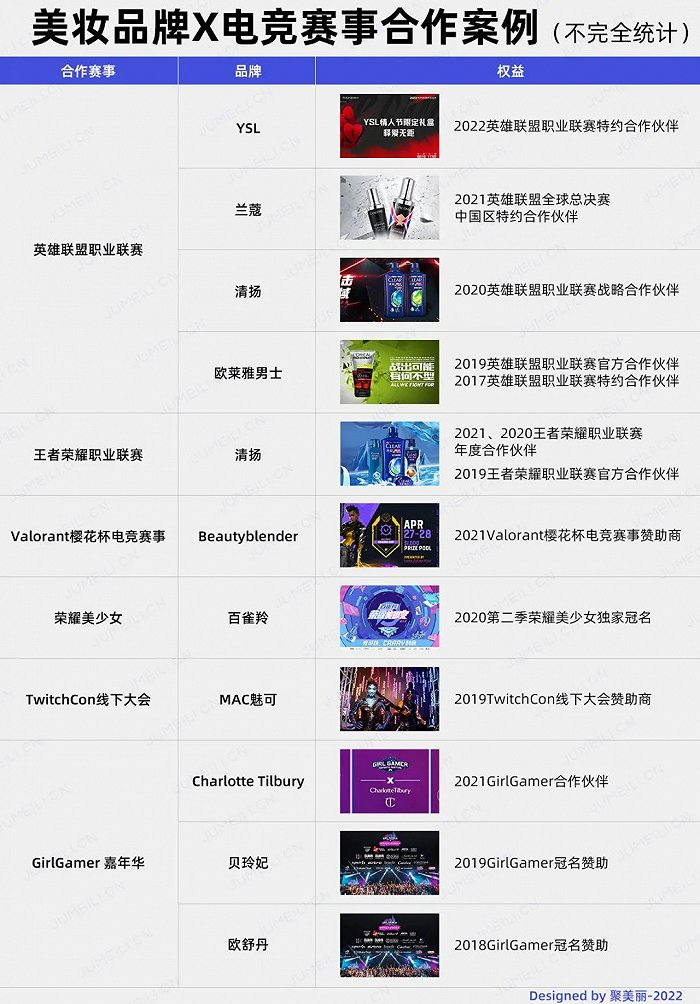 2022年情人节之际,LPL(英雄联盟职业联赛中国区)官宣YSL美妆正式成为英雄联盟职业联赛特约合作伙伴,同期YSL美妆推出情人节限定礼盒;2021年,兰蔻「小黑瓶」修护精华成为英雄联盟职业联赛S11中国区特约合作伙伴。