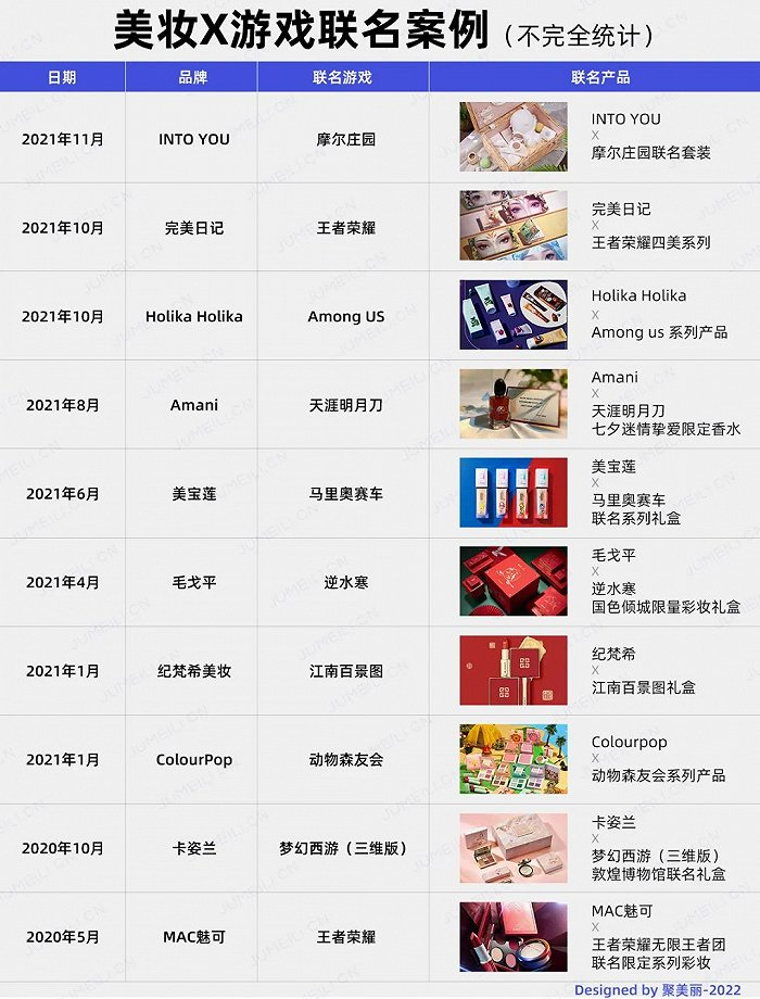 《2021年中国游戏产业报告》显示,2021年中国游戏用户规模达6.66亿人。美妆品牌通过与游戏联名的方式,很大程度上能够触及更多的消费群体。同时,类似《摩尔庄园》、《梦幻西游》等具有一定运营时间的游戏来说,联名合作还会将用户对于游戏的喜爱和忠诚感一定程度上过渡给合作品牌。