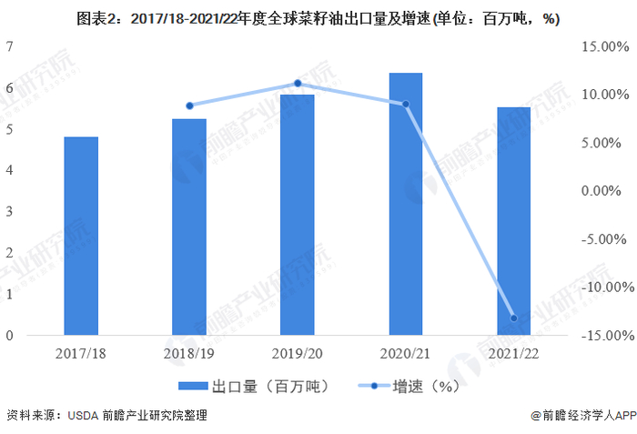 2017/18-2020/21年度,全球菜籽油出口量逐年上升。2020/21年度,全球菜籽油出口量为6.38百万吨,较2019/20年度上涨了9.06%。根据美国农业部于2021年12月的预测数据,2021/22年,全球菜籽油出口量将下降至5.54百万吨。