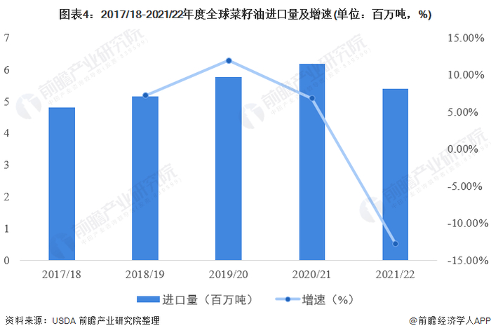 2017/18-2020/21年度,全球菜籽油进口量呈上升趋势。2020/21年度,全球菜籽油进口量达到了6.19百万吨,与2019/20年度相比增长了6.91%。根据美国农业部于2021年12月的预测数据,2021/22年,全球菜籽油进口量将下降至5.40百万吨。