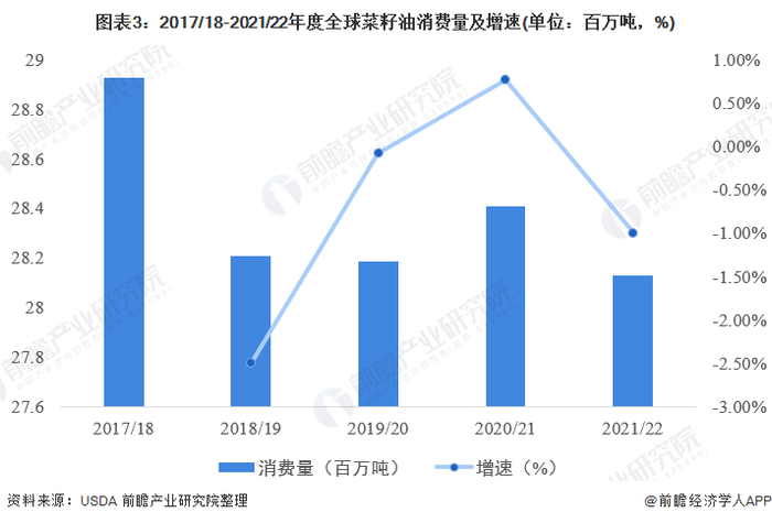 2017/18-2020/21年度,全球菜籽油消费量整体有所下降。2020/21年度,全球菜籽油消费量为28.41百万吨,较2019/20增加0.78%。根据美国农业部于2021年12月的预测数据,2021/22年,全球菜籽油消费量将下降至28.13百万吨。