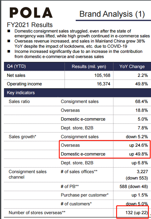 POLA的“日本国内电商业务”虽然占比较小,但增速明显,增长近五成;“海外业务”占比18.8%,增长了24.6%,销售网点数增加了22至132。