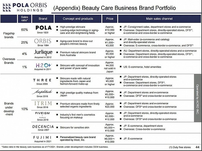 Pola Orbis集团,作为与资生堂SHISEIDO集团、花王Kao集团、高丝Kose集团并列的日本四大化妆品集团之一,旗下有旗舰品牌POLA和ORBIS,收购品牌H2O+和Jurlique以及Three等发展中品牌。
