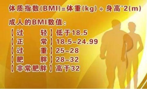 用体重(kg)除以身高的平方(m2),可以得到体质指数。若体质指数为18.5~24.99,说明体重正常;25~28为超重。