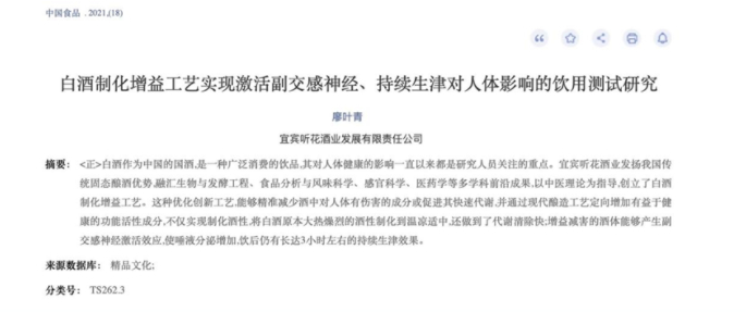 2021年底前,国内行业期刊《中国食品》发表了《白酒制化增益工艺实现激活副交感神经、持续生津对人体影响的饮用测试研究》一文,详细介绍了听花酒对于健康成年人身体机能研究成果。