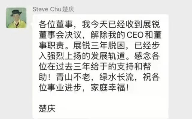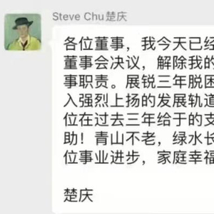 而在傍晚,一张疑似楚庆的留言截图流传在芯片圈,楚庆表示,已收到展锐董事会决议,解除其CEO和董事职责,但强调“展锐三年脱困,已经步入强烈上扬发展轨道。”