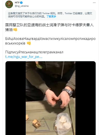 多位社交平台用户认为,乌克兰国民卫队将车臣安全部队人员非人化,称其为“兽人”,涉嫌“纳粹主义”。此外,乌克兰国民卫队在子弹上抹猪油,涉及“侮辱宗教信仰”。