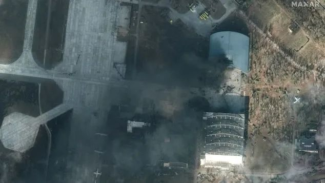 MAXAR卫星图像显示,安东诺夫机场安-225停放的飞机库曾经遭到轰炸并起火。
