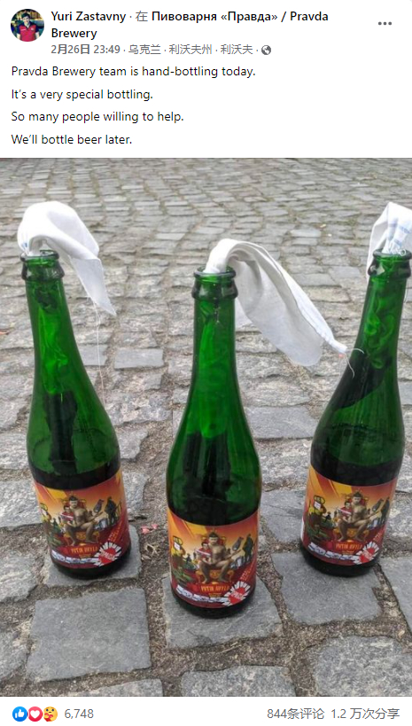 图片反搜可知,啤酒厂“真理报”老板尤里·扎斯塔夫尼2月26日在其脸书主页发布了用啤酒瓶制作燃烧瓶的照片。扎斯塔夫尼表示,制作燃烧瓶的想法来自其员工——他们中的很多人都曾经参与过2014年克里米亚战争。