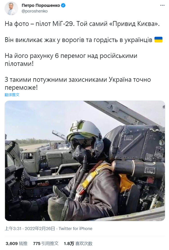 当地时间2月24日,乌克兰前总统波罗申科发推,确认“基辅幽灵”的存在,称他“6次战胜俄罗斯飞行员”,“让乌克兰人感到骄傲”。