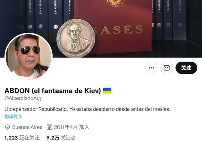 但这位“阿布多诺夫”均经编辑处理,照片中人实为一名为“ABDON (el fantasma de Kiev)”的推特网友。这位用户居住在阿根廷首都布宜诺斯艾利斯,所有推文均用西班牙语发布,内容极为搞怪。目前,没有证据证明这位推特用户就是外界疯传的“基辅幽灵”本人。