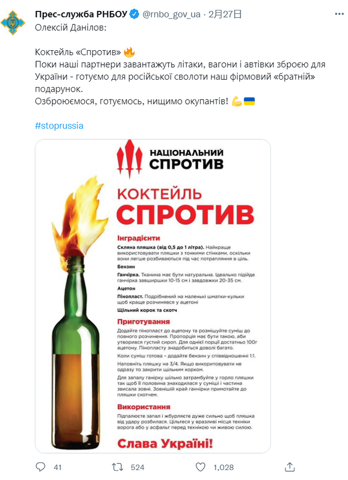 2月26日,乌克兰国家安全和国防委员会还在推特上发布了如何制作燃烧瓶的指示。