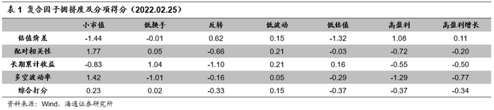 下表展示了使用截至2022年2月25日的数据计算得到的常见因子的拥挤度。