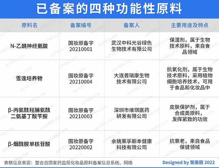 2021年8月24日,根据国家药监局化妆品原料备案信息系统显示,“雪莲培养物”和“β-丙氨酰羟脯氨酰二氨基丁酸苄胺”两个新原料备案成功。
