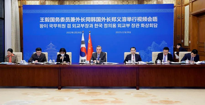 2022年2月28日,国务委员兼外长王毅同韩国外长郑义溶举行视频会晤。