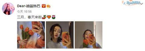 3月1日上午,迪丽热巴在社交平台晒出三张自拍照,并配文:“三月,春天来啦。”画面中,热巴穿着渐变色套头卫衣,对着镜子自拍,满脸胶原蛋白,碎发修饰脸颊慵懒风十足,连手机壳和手中的郁金香花束都特意选择了同色系。