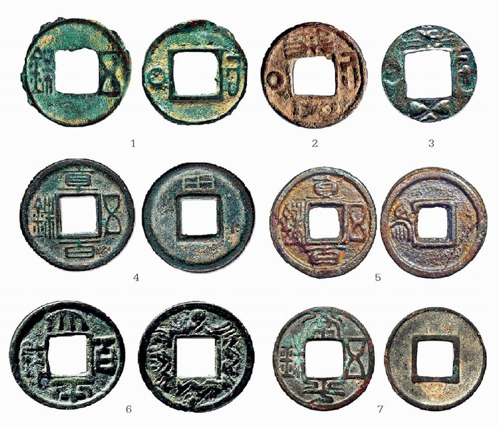 汉承秦制,汉初货币仍采用秦方孔半两铜钱,每枚重十二铢〔图二:1、2〕。由于允许民间私铸钱,汉初半两钱往往改铸成名不符实的八铢、六铢、四铢半两钱,乃至严重偷工减料的“榆荚”半两钱。汉武帝建元元年(前140),始行三铢钱〔图二:3〕。《汉书·食货志》曰:“令县官销半两钱,更铸三铢钱,文如其重。盗铸诸金钱罪皆死,而吏民之犯者不可胜数。”此外,汉武帝元狩四年(前119)还发行大额虚币“白金三品”。《史记·平准书》记载:“又造银锡为白金。以为天用莫如龙,地用莫如马,人用莫如龟,故白金三品:其一曰重八两,圜之,其文龙,名‘白选’,值三千;二曰以重养小,方之,其文马,值五百;三曰复小,撱之,其文龟,值三百。”