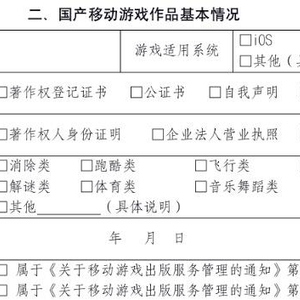 据有关规定,游戏公司在正式出版网络游戏作品之前,必须提交《出版国产电脑网络游戏作品申请书》或《出版国产移动游戏作品申请表》。国家新闻出版署官网提供的《出版国产移动游戏出版申请表》(以下简称“《申请表》”)中第二项,便要求游戏公司填写所申请的国产移动游戏的基本情况。