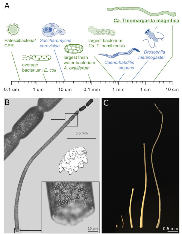在这项发现之前,已知最大的细菌是一种体长近1毫米的硫细菌。由于发现地点是纳米比亚海岸的沉积物,因此这种细菌被命名为纳米比亚嗜硫珠菌(Thiomargarita namibiensis)。相比之下,此次发现的新型细菌,体长至少是前者的10倍。