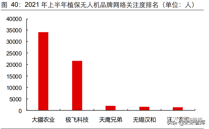 农业无人机和农机自动导航设备是当前精准农业两大主要产品。农业无人机对于集成、 操控技术要求较高,使用成本和难度均较大,落地速度较慢。农业无人机中数量最大、 增长最快的为植保无人机,根据农机通数据披露,2021 年上半年植保无人机品牌关注 度最高的前五名分别为大疆农业、极飞科技、天鹰兄弟、无锡汉和、沃得农机。其中, 大疆农业、极飞科技关注度大幅领先于其他企业,植保无人机行业头部集中效应明显。