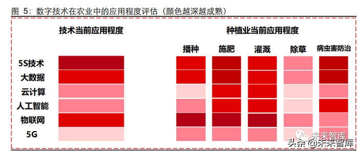 精准农业是智慧农业的第一站,其主要依靠 5S 技术,当前已经发展成熟。5S 技术包括 遥感、地理信息系统、全球定位系统、数字摄影测量系统、专家系统等,目前在农业中的应用已经较为成熟。在 5S 技术精准定位导航的作用下,耕种、收割等适合中大型农机作业的简单场景有望率先落地。大数据、物联网等技术也在农业领域中逐渐应用,主要用于智能施肥、灌溉设备的构建,在 5S 技术的配合下,有望推动播种、施肥、灌溉、 除虫等场景快速落地。