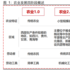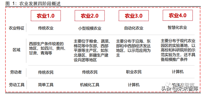 农业问题直系民生,自古以来皆为国之根本,如何提高农业产值是每个时代都须正视的 问题。中国农业发展可分为四个阶段:农业 1.0 为传统农业,生产工具简单,生产效率较低,不具备天灾抵抗能力;农业 2.0 为小型规模化农业,其利用农业机械实现规模化 生产,以提高生产效率;农业 3.0 为自动化农业,职业农民利用软件、硬件设备等实现 大范围、精准化作业,大幅提高资源利用率;农业 4.0 为智慧化农业,其在 3.0 的基础 上继续深化农业数字化、智能化程度,通过各类传感器设备获取数据,对农业资源进行 更深层次整合,真正实现无人化生产。总结来看,智慧农业是农业信息化发展从数字化 到网络化再到智能化的高级阶段,其中精准农业和数字农业是智慧农业的组成部分。