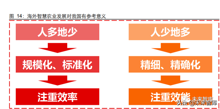 生物科技与药肥产业对于整体农业生产影响重大,而农业作业模式则同样重要。考虑到 我国耕地种类复杂多样的特点,农业作业智能化应因地制宜。在东北、新疆等地区,耕 地较为集中平整,地均劳动力较少,大型农机应用较多,有望较快实现农业自动化作业。在江浙云贵等地区,耕地较为零碎不平,难以进行大规模的机械化作业,更为适合以日 本为代表的小型农业机械精细化作业。而在基本实现农业自动化、精准化后,我国农业 发展将朝着以色列农业为代表的科技赋能智慧农业方向。(报告来源:未来智库)