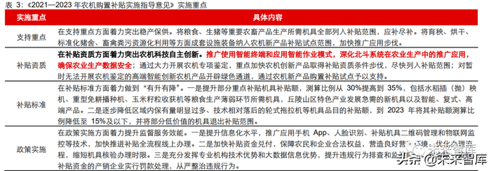 农业政策扶植更加精准,着力补贴农机科技自主创新类设备。根据农业部、财政部发布 的《2021—2023 年农机购置补贴实施指导意见》,在补贴资质方面着力突出农机科技自 主创新,推广使用智能终端和应用智能作业模式,深化北斗系统在农业生产中的推广应 用,确保农业生产数据安全;在补贴标准方面着力做到“有升有降”,提升部分重点补贴 机具补贴额,测算比例从 30%提高到 35%。