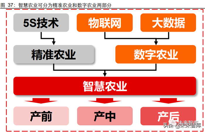 智慧农业是农业信息化发展从数字化到网络化再到智能化的高级阶段,其中精准农业和 数字农业是智慧农业的组成部分。总体来看,智能农业可划分为产前、产中、产后三部 分。其中,精准农业主要涉及产前和产中,其主要依靠以高精度定位为主的 5S 技术, 数字农业则主要涉及产中和产后,其主要依靠物联网、大数据等技术。