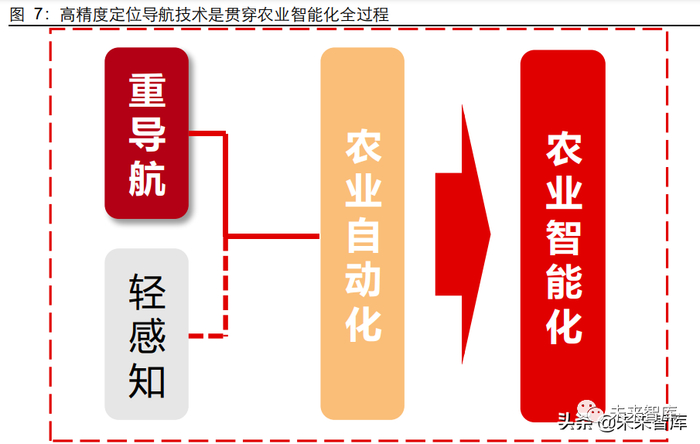 高精度定位导航技术将始终在农业智能化中扮演核心角色。农业智能化需建立在自动化 的基础之上,而农业自动化第一步则是赋予农业生产工具自动行驶能力。农业生产工具 包括但不限于中大型农机、农业无人车、农业无人机等,其自动驾驶所需功能与汽车类似,均需具备环境感知、定位导航,但考虑到农田环境遮挡多、植被多、干扰少的特点, 农机和无人机自动化作业主要依赖定位导航而非感知识别。