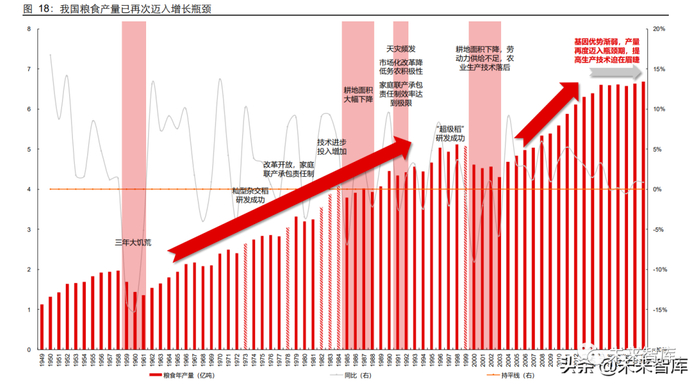 粮种基因红利渐淡,粮食年产量迈入增长瓶颈,依靠科学技术提高生产效率迫在眉睫。通过复盘我国粮食产量情况,我们发现在过去几十年中推动我国粮食总产量提升的原因 主要有两个:家庭联产承包责任制带来的生产积极性的提高、杂交水稻研发带来的粮种 基因红利。其中,家庭联产承包责任制的效率已在 1991 年左右达到极限,而杂交水稻 的粮种基因红利也随着其渗透率的不断增长而渐淡。自 2015 年以来,我国粮食产量保 持相对稳定,增长陷入瓶颈期,如何使粮食产量继续增长成为当下必须要面对的难题。