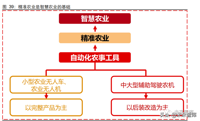 精准农业是智慧农业的基础,是农业智能化征程的第一步。精准农业当前主要涉及的产 业为自动化的农事工具,如中大型辅助驾驶农机、小型农业无人车、农业无人机等。其 中,小型农业无人车和农业无人机主要以完整产品形式提供,而中大型辅助驾驶农机则 主要以后装改造为主,涉及卫惯组合导航、电动方向盘、显示器、天线、角度传感器、 控制箱等多个产品。(报告来源:未来智库)